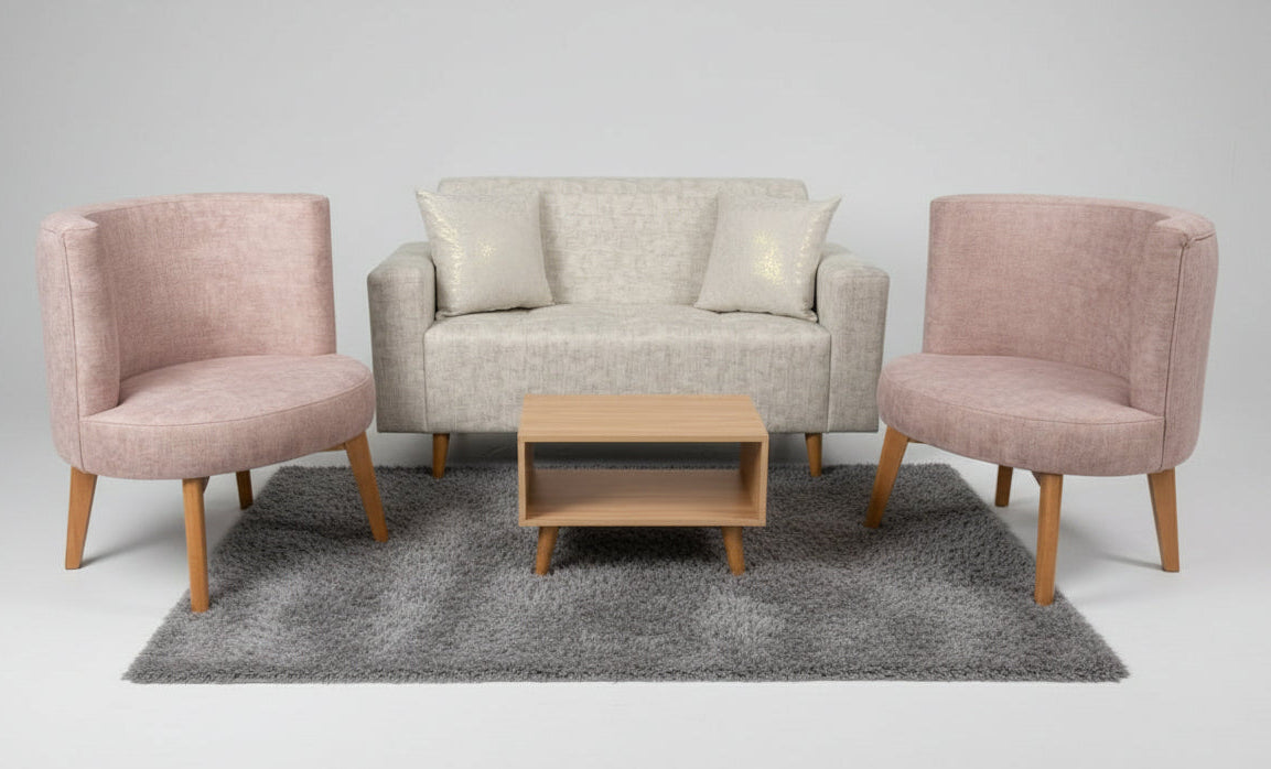 Sala apartamento con un estilo minimalista.  Estructura en madera de Vaquerá y Cedro. espumas de alta densidad 2 cojines decorativos sofá + 2 sillas auxiliares $T: 23 C: 9